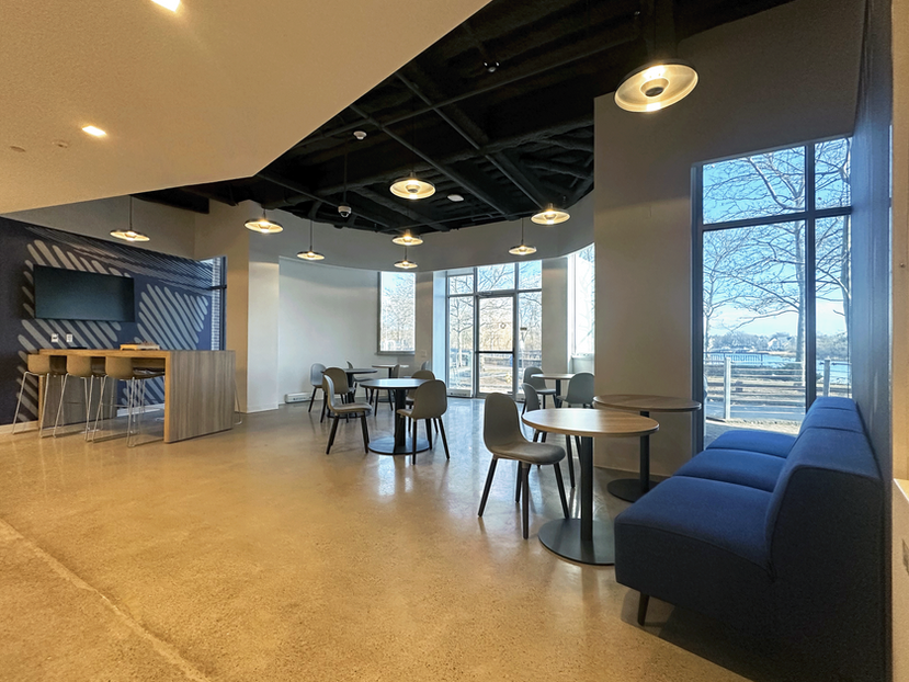 The resulting design employs elements of industrial flavor with a sophisticated finish palette, keeping in mind acoustical concerns for an open office environment.